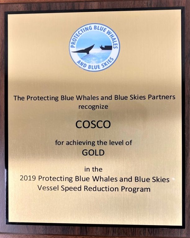 March 2019 – COSCO SHIPPING LINEs was recognized by the NOAA for our outstanding participation in the 2018 Vessel Speed Reduction off the Northern California coast to cut air pollution and protect endangered whales. The program is entirely voluntary so the awards carry prestigious recognition and appreciation from many entities including, CARB, and AQMD, as well as from many California State Assembly and Senate districts and U.S. Congressional recognition. For 2018, COSCO SHIPPING LINEs achieved Gold and Silver awards depicting a 50-75% nautical speed compliance of 10 knots or less through specified California coastal waters. These awards placed us third overall for our voluntary participation and conservation efforts in protecting the environment.